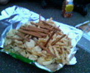 巨大なポテチ他の山を食べるうちら。上の写真がそれです。